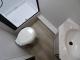 The Jay Feather bathroom features a fancy high-rise gooseneck faucet, porcelain foot-flush toilets and an innovative roller-style shower enclosure that opens up the bathroom space.